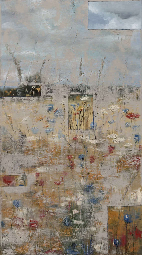 Chabry, maki, rumianki usłane w zbożu jawią się zza zasłony. “Z za” SPRZEDANY 2025 olej na płótnie wym. 90×50