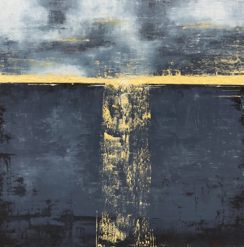 Obraz zainspirowany Morzem Bałtyckim, które oświetlone księżycem stworzyło tak piękną gamę barwną. „Światło za horyzontem” SPRZEDANY 2023 olej na płótnie wym. 110×110