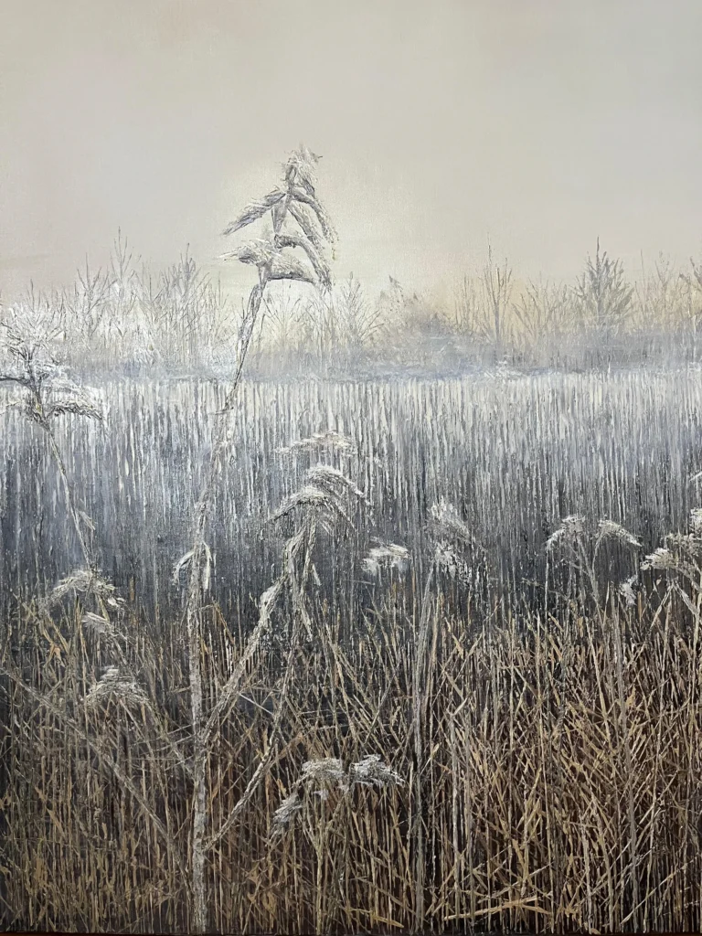 “trawiaste” to obraz, któryinspirowany jest zimnym porankiem,suche trawy na polu, spowite mgłą, lekkooszronione, magiczne, ”Trawiaste 1” SPRZEDANY 2024 olej na płótnie wym. 90×150 ”Trawiaste 2” SPRZEDANY 2024 olej na płótnie wym. 120×100