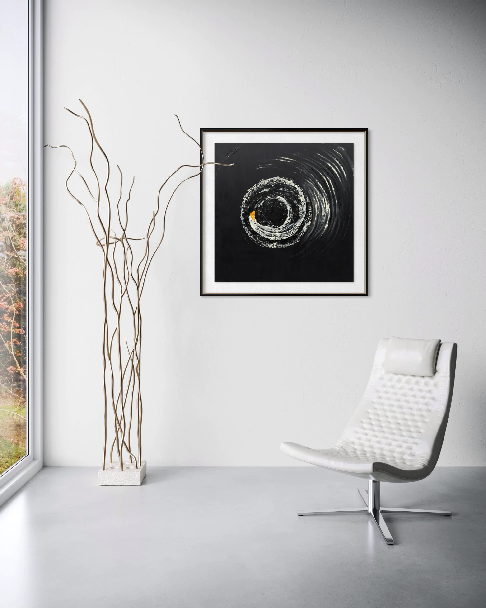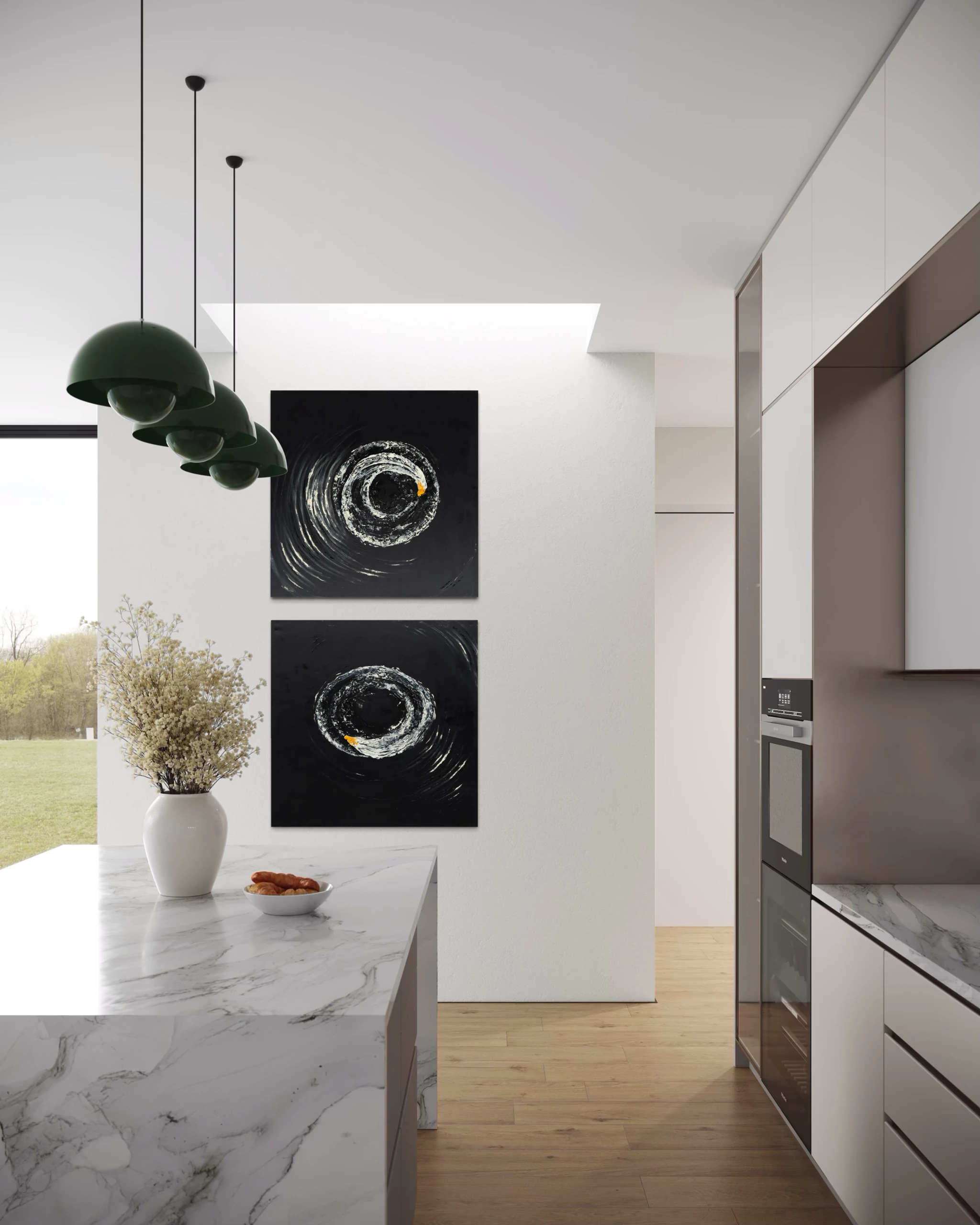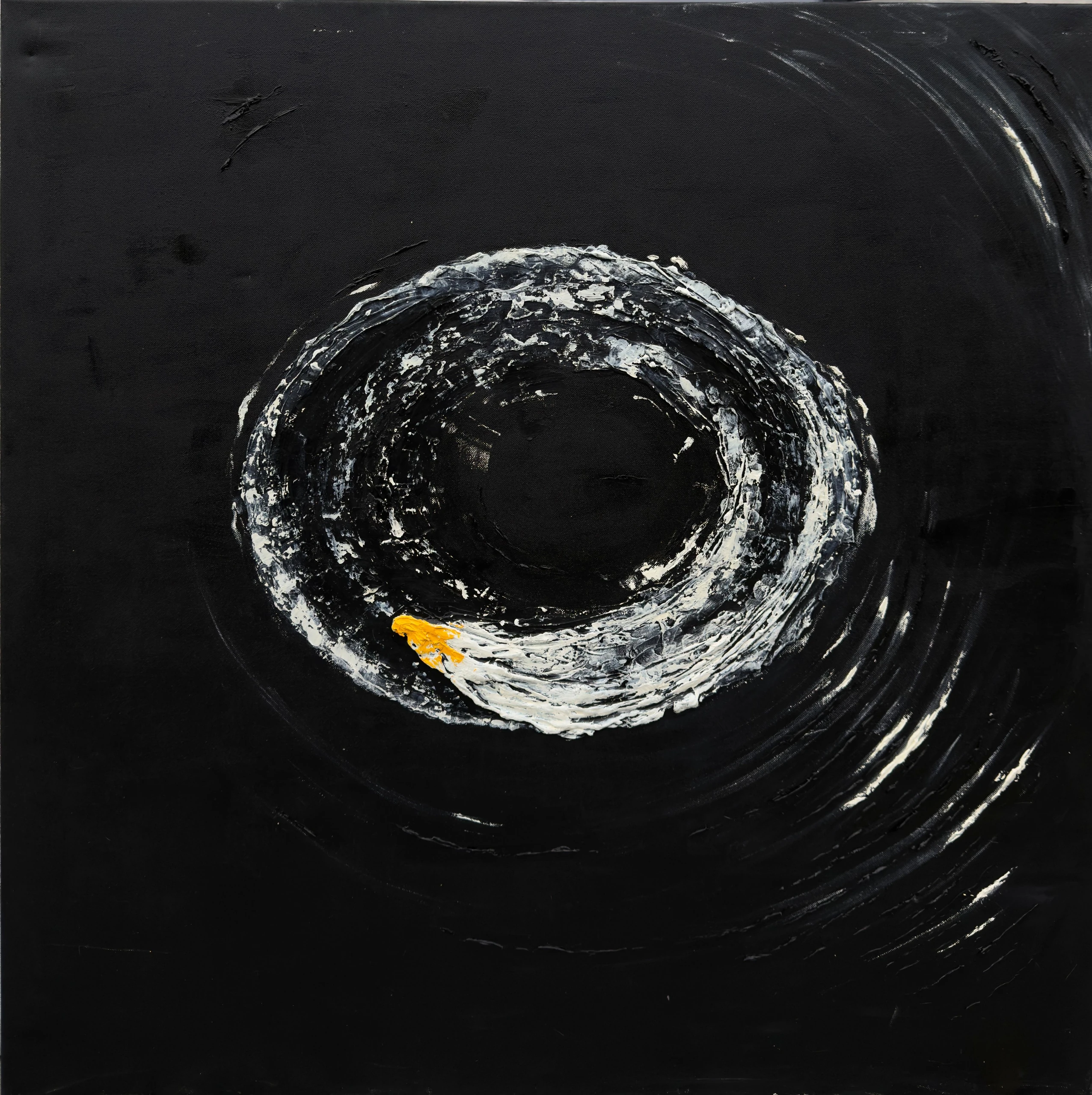 Inspiracją do tego dyptyku była wirująca motorówka na Morzu Bałtyckim. Patrząc na te obrazy mamy wrażenie, że ciągle wirują, a żółta dominanta nadaje im ciepła, w tej głębokiej czerni. Bardzo dobrze komponują się razem.